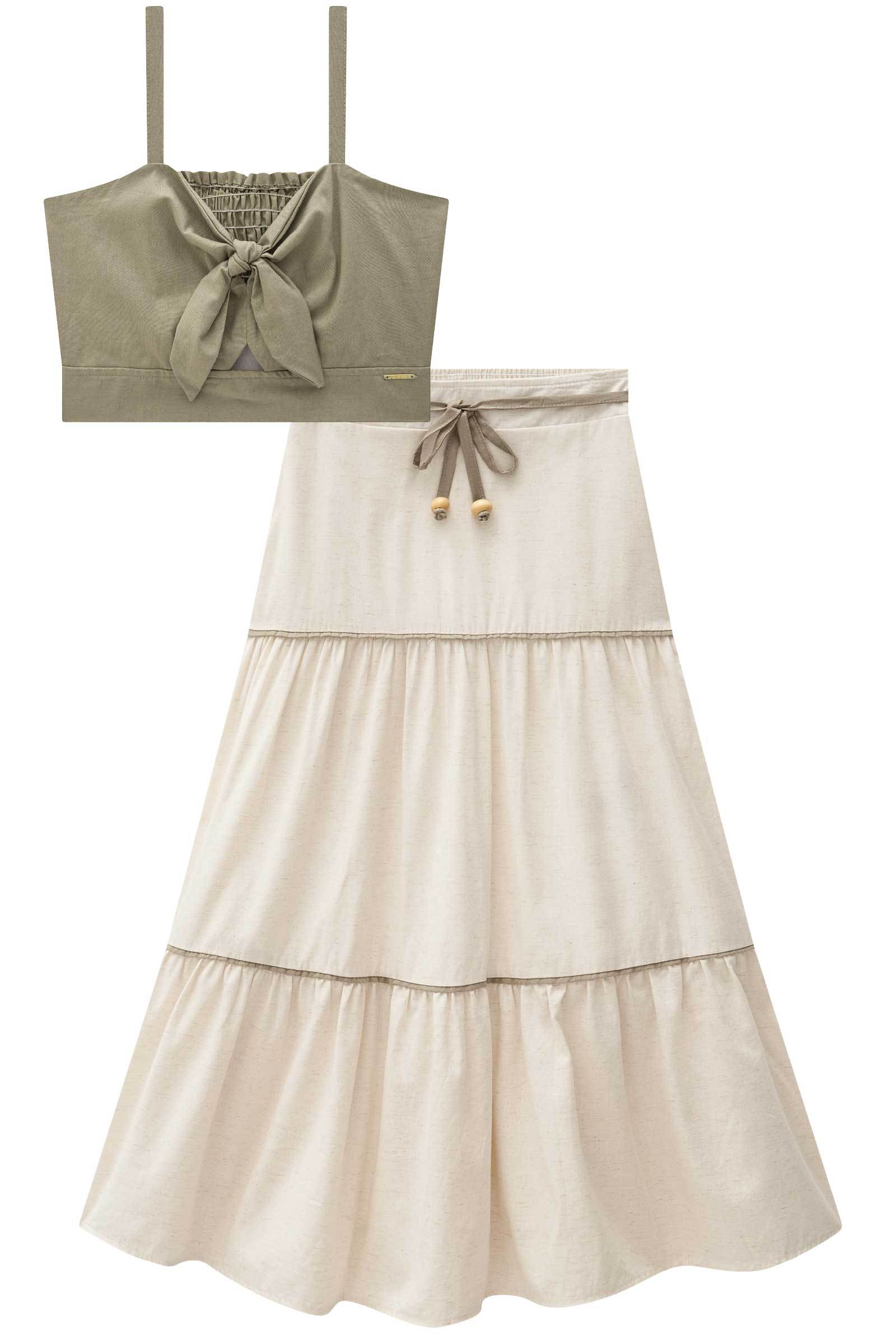 O conjunto de top cropped e saia mii em linho deluxe é perfeito para quem busca conforto, leveza e muito estilo. Disponível em uma cor super estilosa - verde - este conjunto é a escolha ideal para os dias de mais quentes.