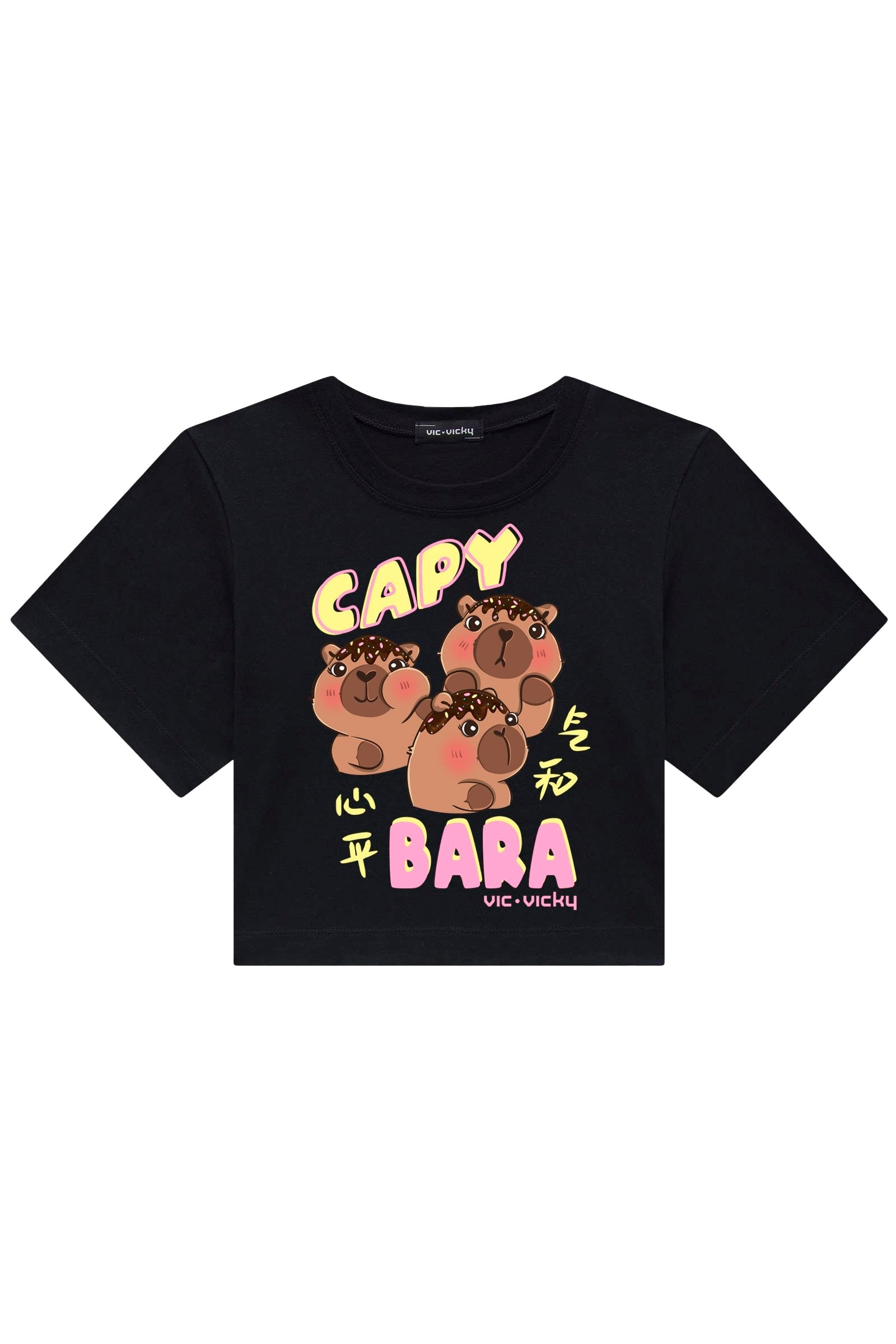 A camiseta boxy over em meia malha é a peça perfeita para as garotas que amam um visual descolado e confortável, com uma modelagem moderna e estampa divertida. Disponível em uma cor super estilosa - preto - ela é ideal para compor looks cheios de personalidade.