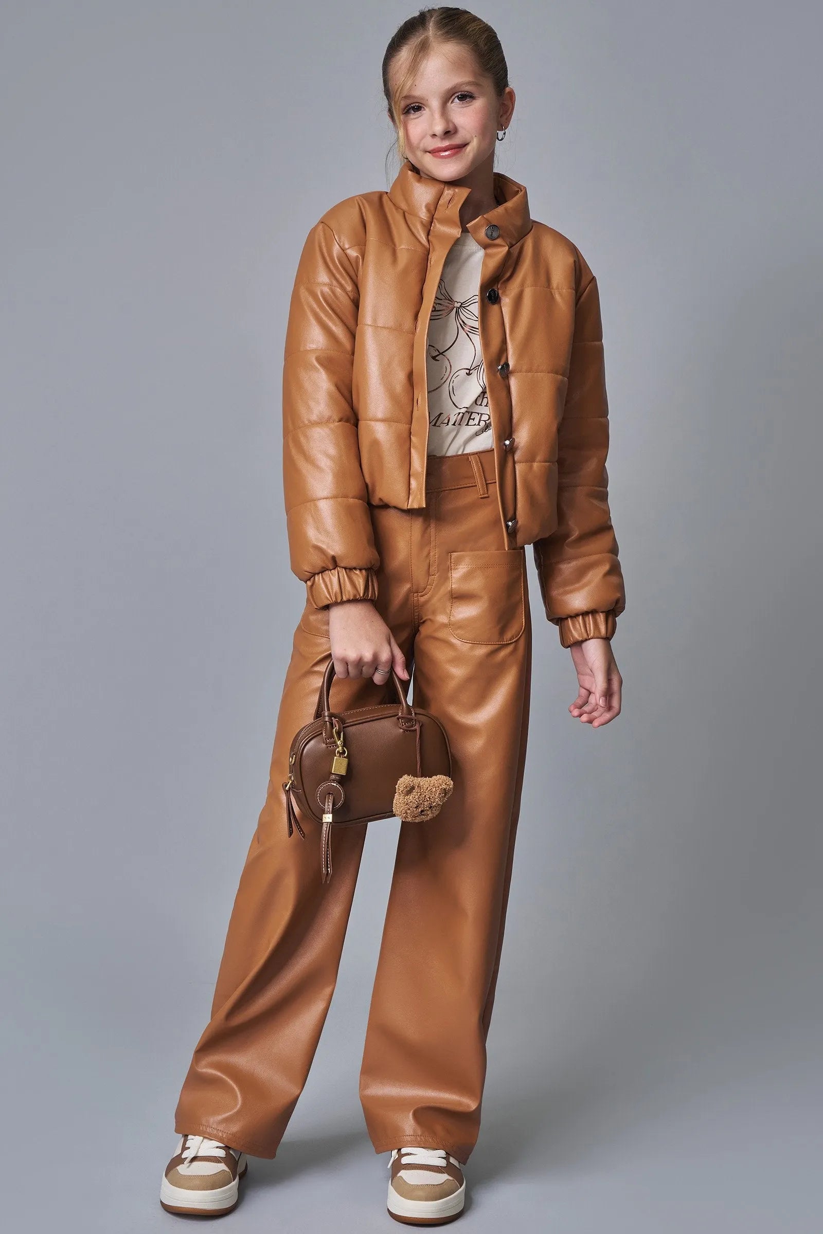 A calça wide leg em couro sintético, é a escolha perfeita para as meninas que amam um look cheio de conforto, sem abrir mão do estilo no dia à dia! Disponível em duas cores super estilosas - bege e preto - ela é uma peça essencial, perfeita para montar diversos looks e deixar o inverno das pequenas ainda mais estiloso!