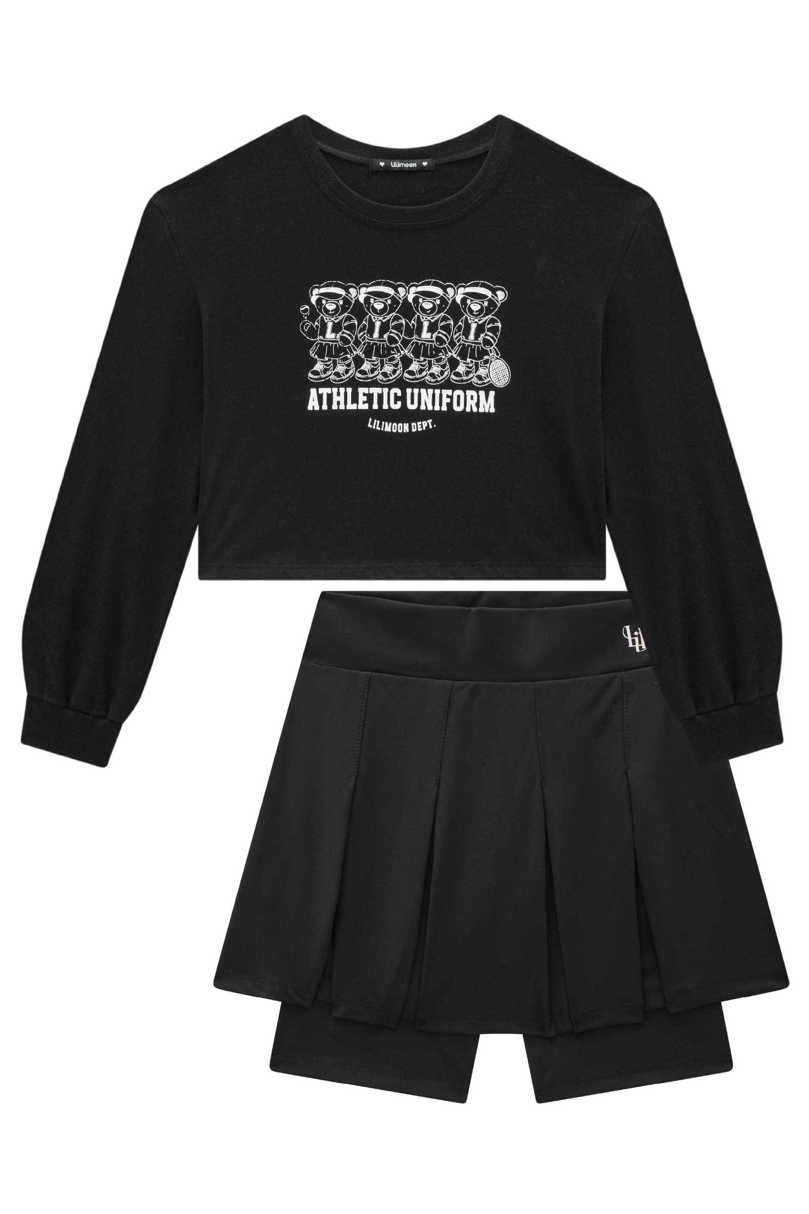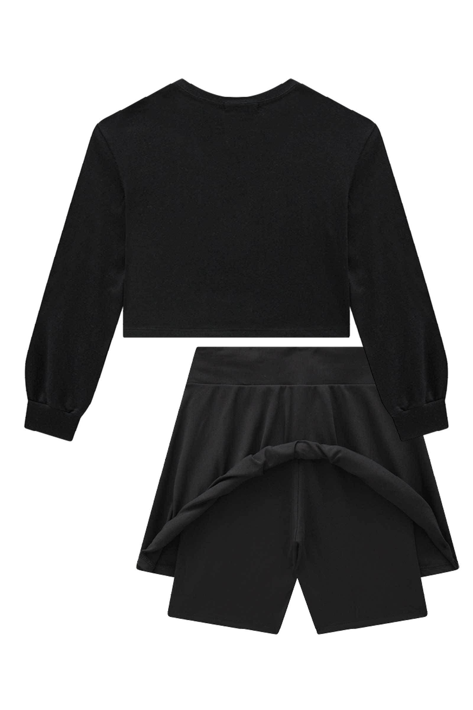 O conjunto de blusa cropped em meia malha e saia em poliamida com shorts embutido, é a escolha perfeita para as meninas que amam um look cheio de conforto, sem abrir mão do estilo no dia à dia! Disponível em uma cor super estilosa - preto - ela é uma peça essencial, perfeita para montar diversos looks e deixar o inverno das pequenas ainda mais estiloso! A estampa divertida, adiciona um charme especial à peça.