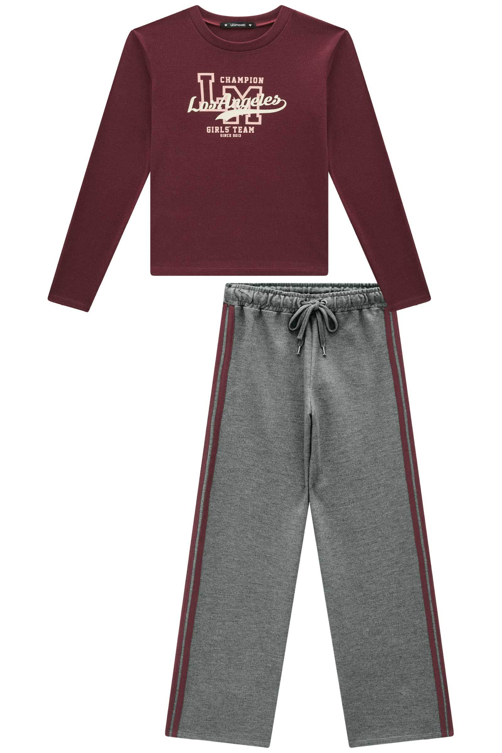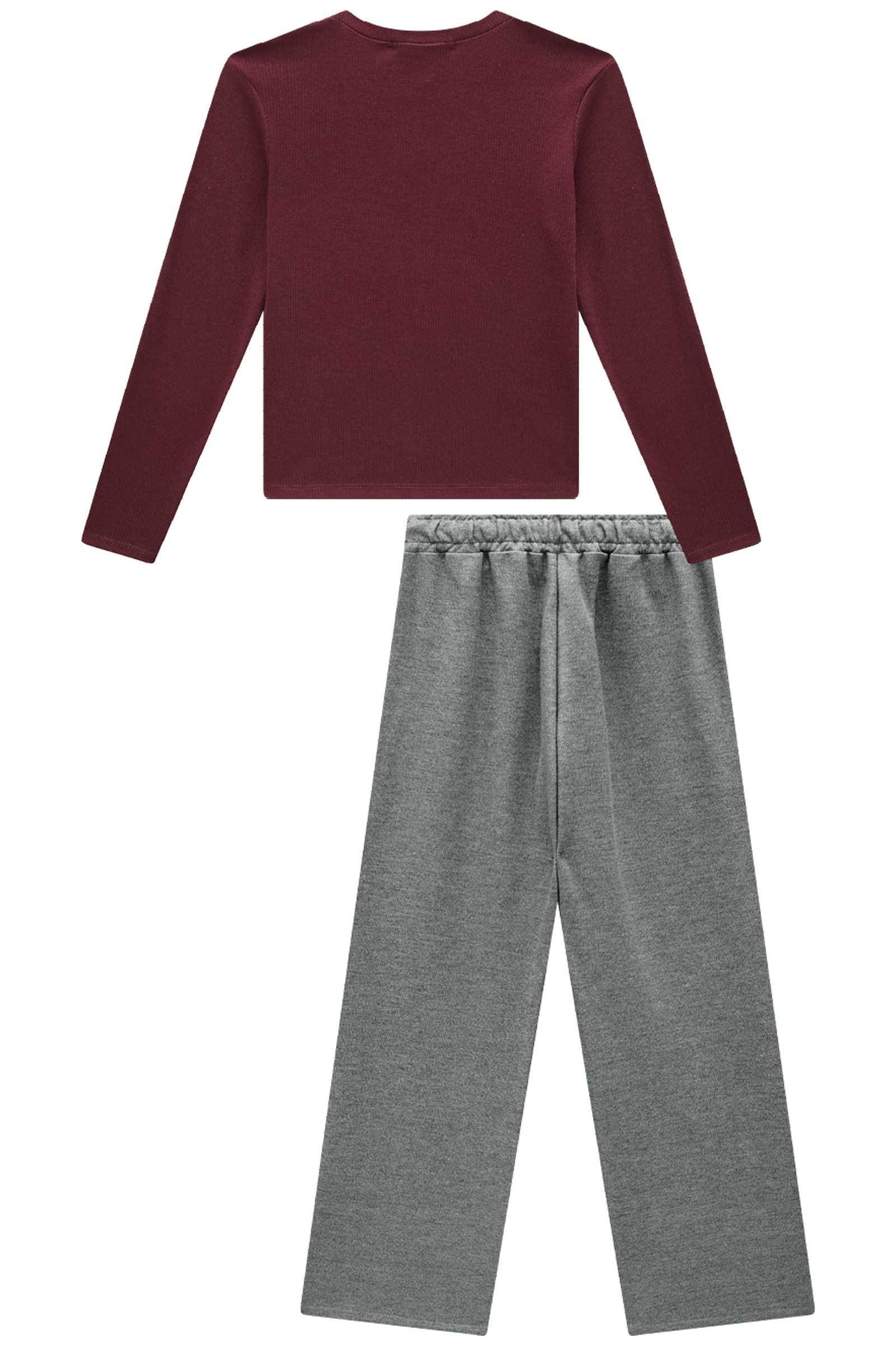 O conjunto de blusa em canelado liz e calça wide leg em moletom sem pelúcia, é a escolha perfeita para as meninas que amam um look cheio de conforto, sem abrir mão do estilo no dia à dia! Disponível em uma cor super estilosa - bordô - ela é uma peça essencial, perfeita para montar diversos looks e deixar o inverno das pequenas ainda mais estiloso! A estampa divertida, adiciona um charme especial à peça.