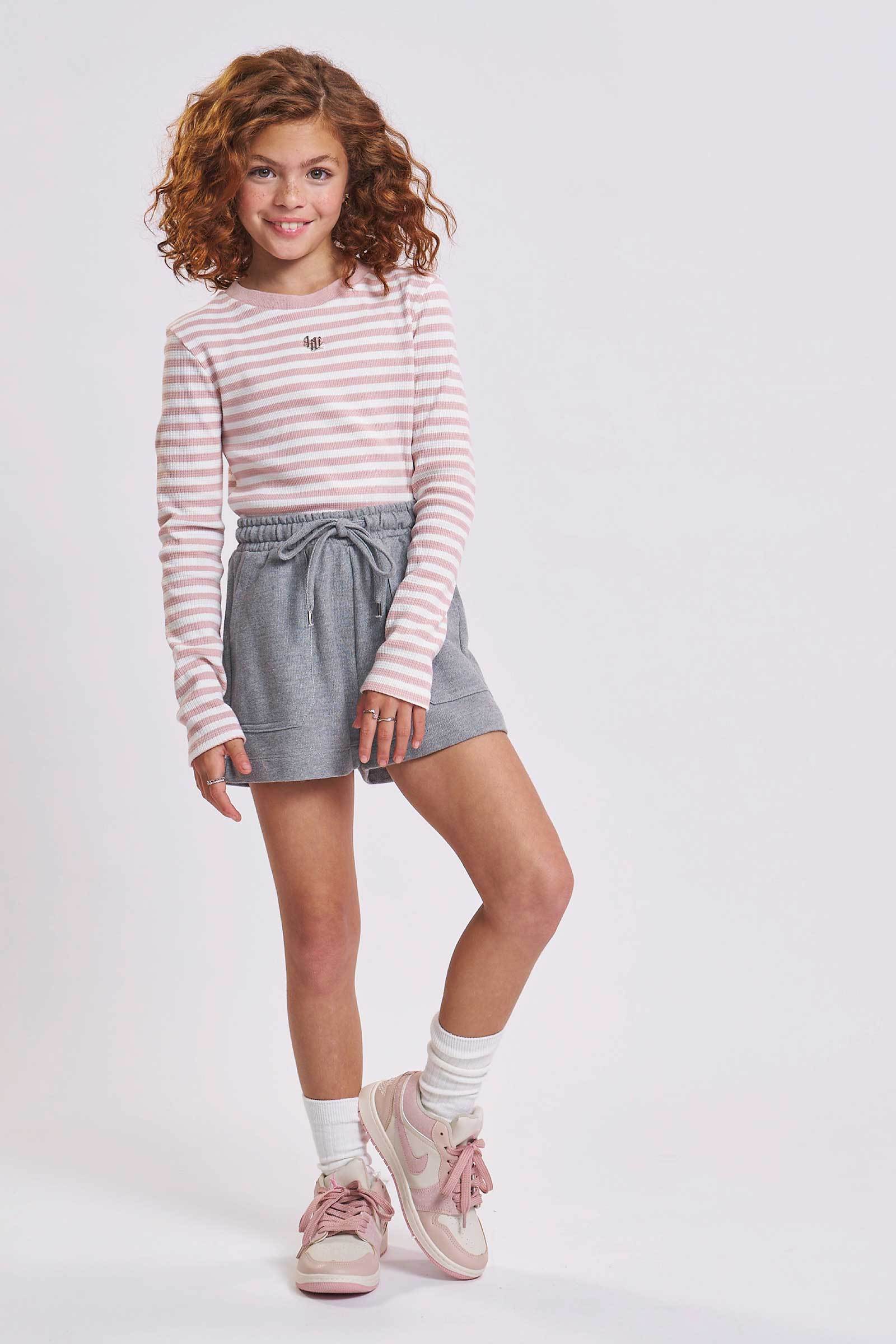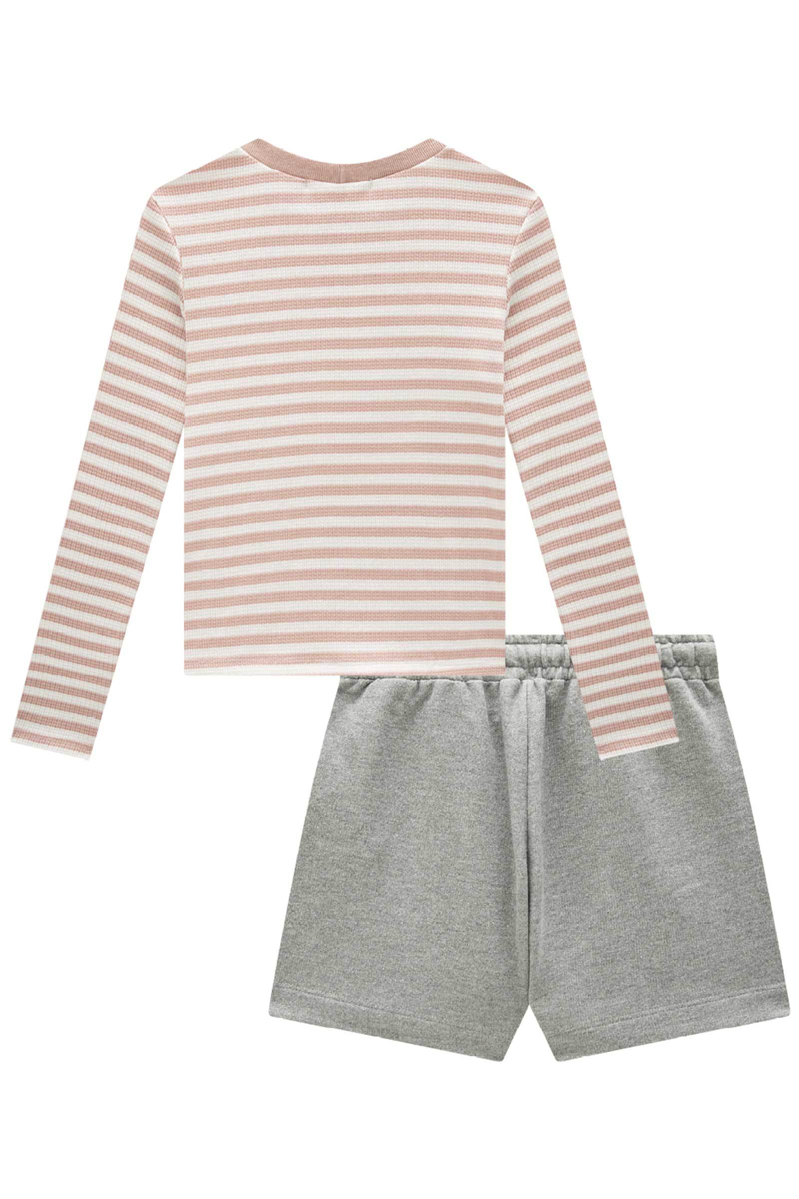 Conjunto de Blusa em Malha Waflle Listrada e Shorts em Moletom sem Pelúcia 91857 Lilimoon Teen Menina