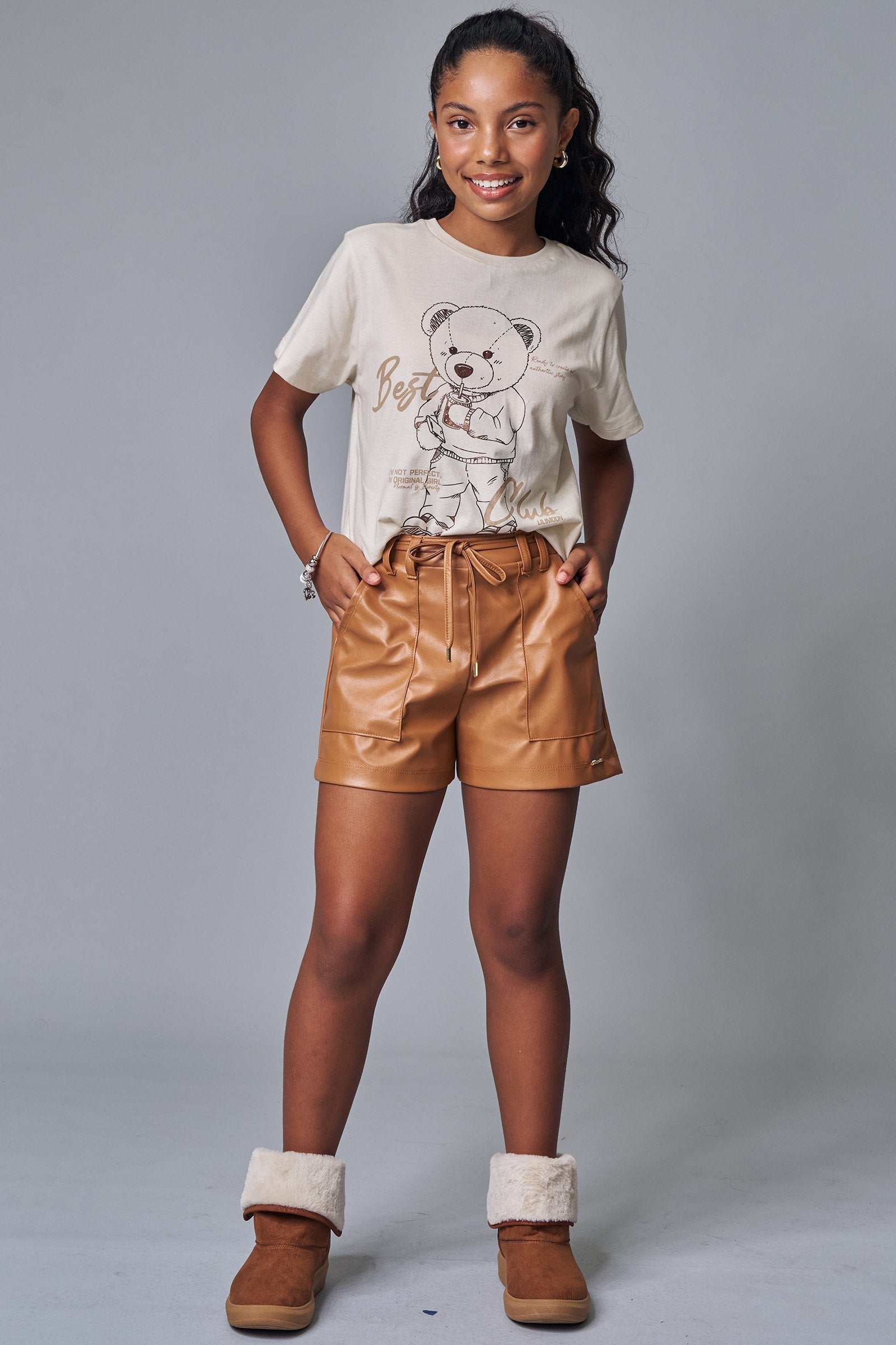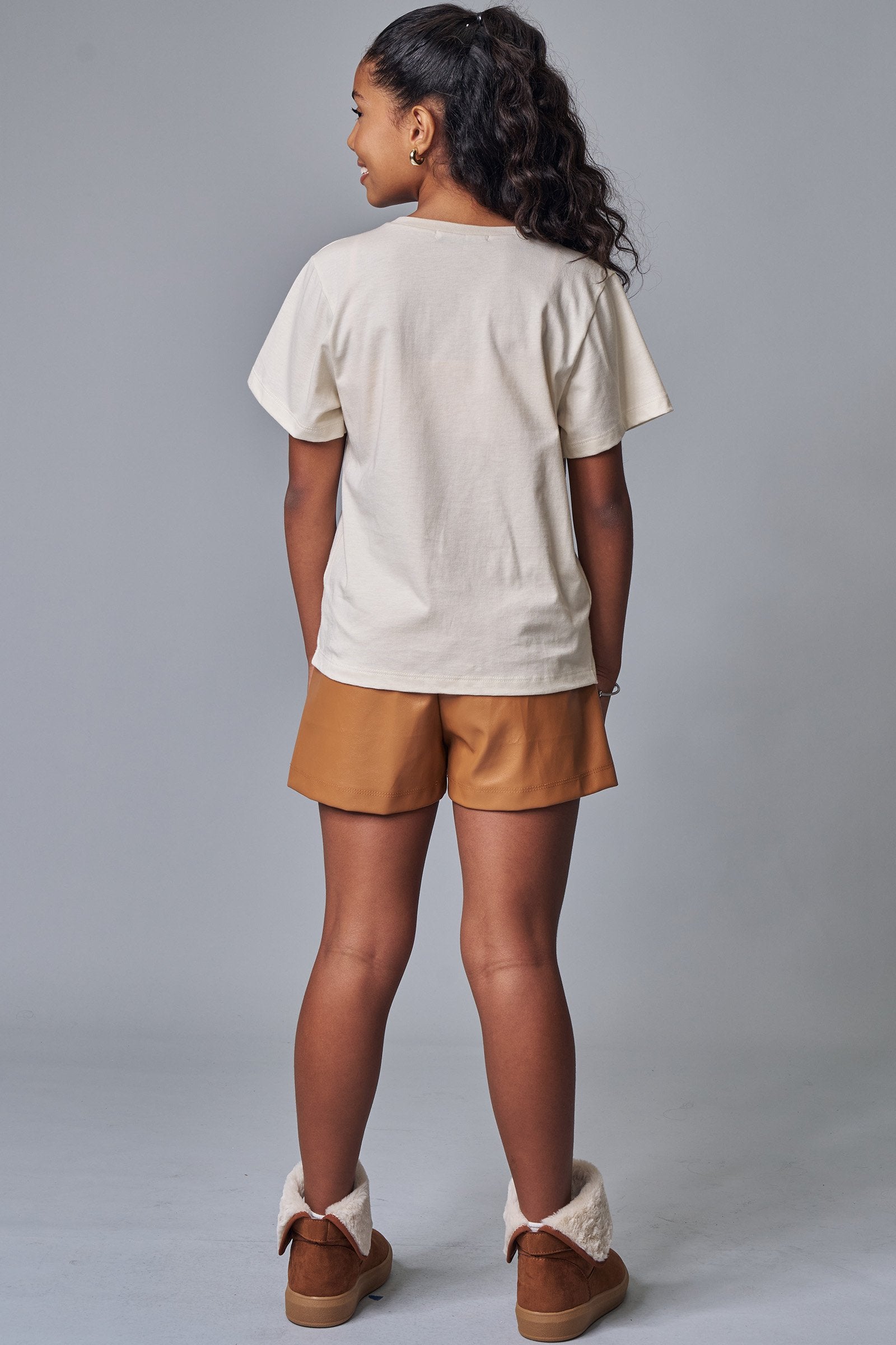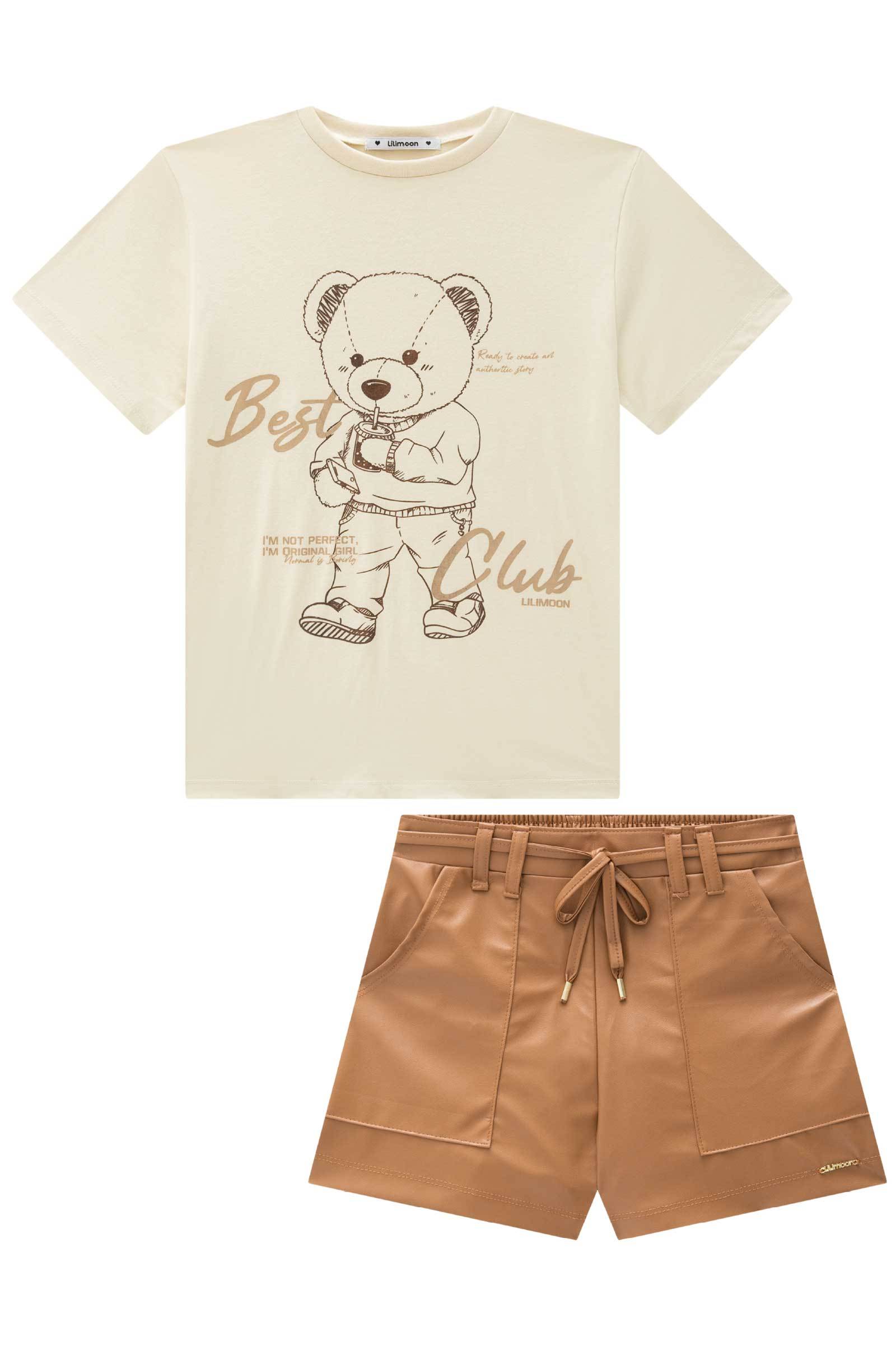 O conjunto de camiseta comfy em meia malha e shorts em couro sintético, é a escolha perfeita para as meninas que amam um look cheio de conforto, sem abrir mão do estilo no dia à dia! Disponível em uma cor super estilosa - bege - ela é uma peça essencial, perfeita para montar diversos looks e deixar o inverno das pequenas ainda mais estiloso! A estampa divertida, adiciona um charme especial à peça.