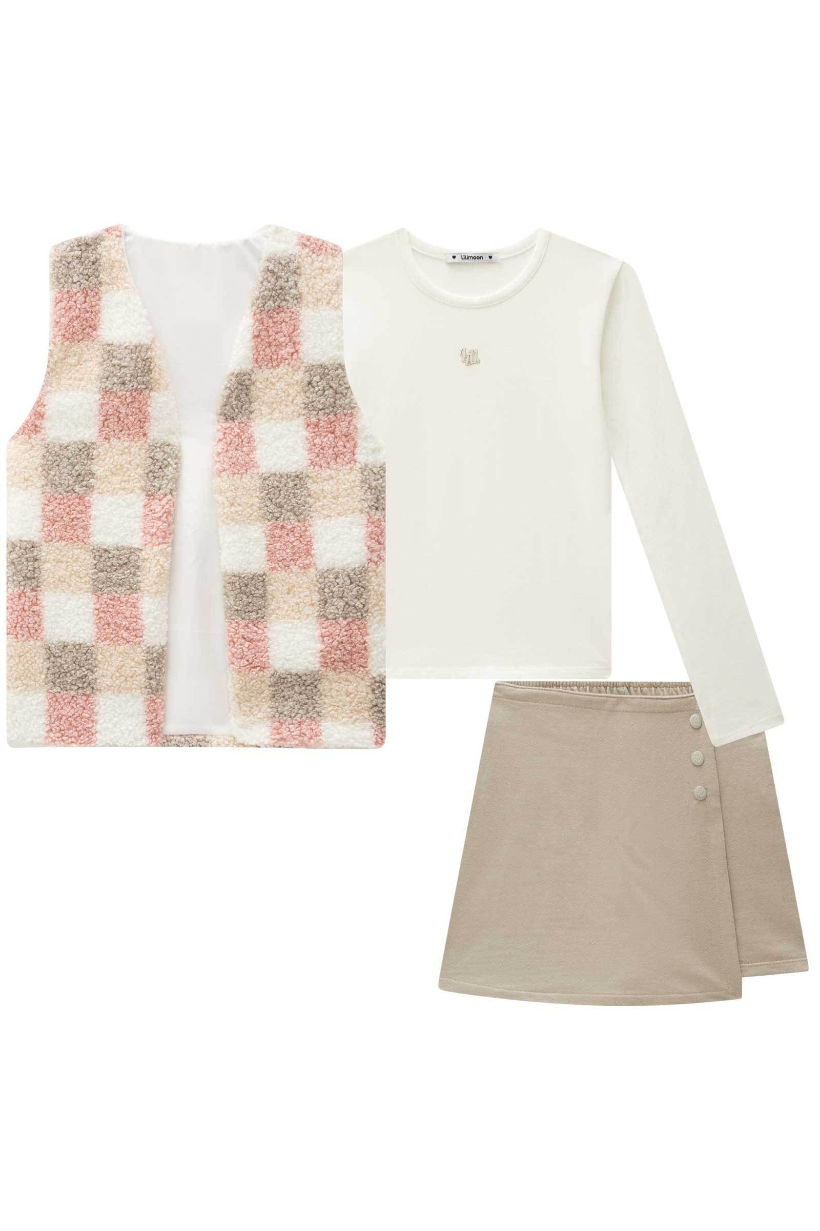 O trio de blusa em cotton, colete em pelo sintético e short saia em moletom sem pelúcia, é a escolha perfeita para as meninas que amam um look cheio de conforto, sem abrir mão do estilo no dia à dia! Disponível em uma cor super estilosa - bege - ela é uma peça essencial, perfeita para montar diversos looks e deixar o inverno das pequenas ainda mais estiloso!