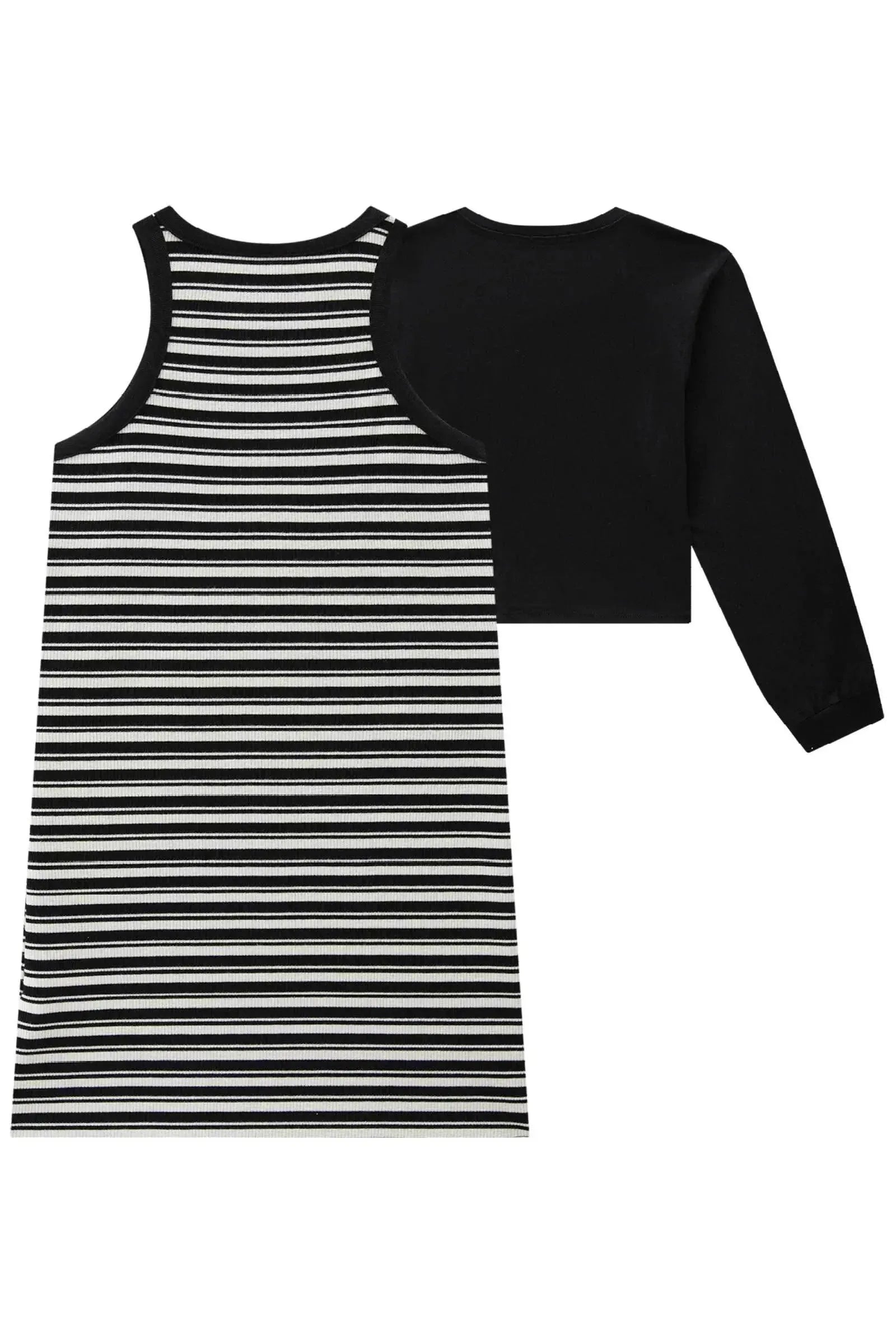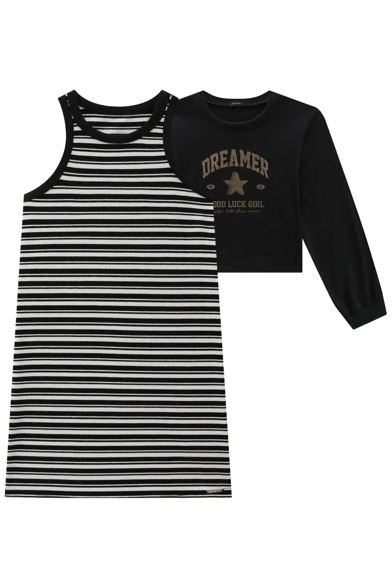 O vestido em canelado luna de viscose e blusa boxy over sobreposição em meia malha, é a escolha perfeita para as meninas que amam um look cheio de conforto, sem abrir mão do estilo no dia à dia! Disponível em uma cor super estilosa - preto - ela é uma peça essencial, perfeita para montar diversos looks e deixar o inverno das pequenas ainda mais estiloso! A estampa divertida, adiciona um charme especial à peça.