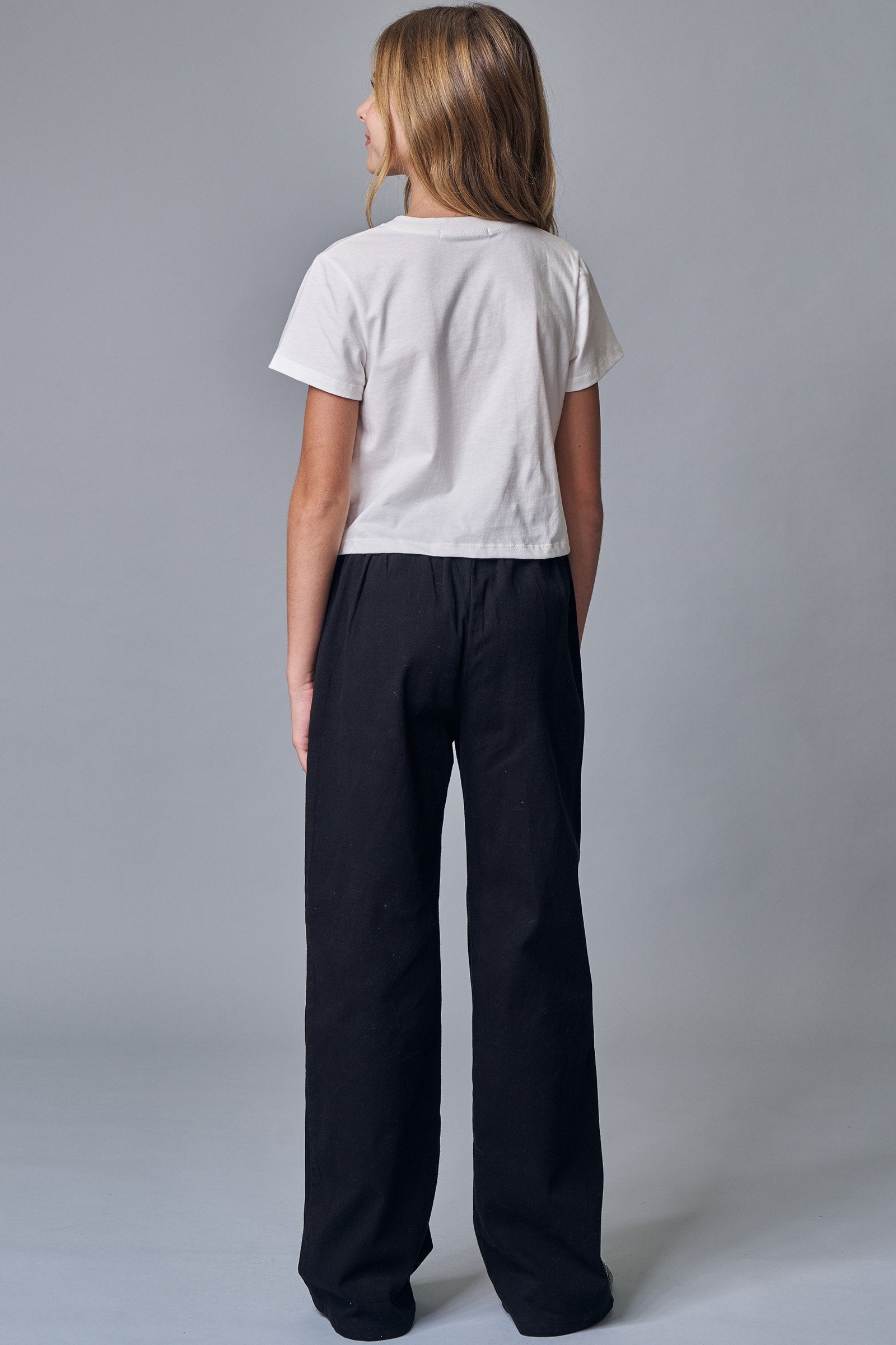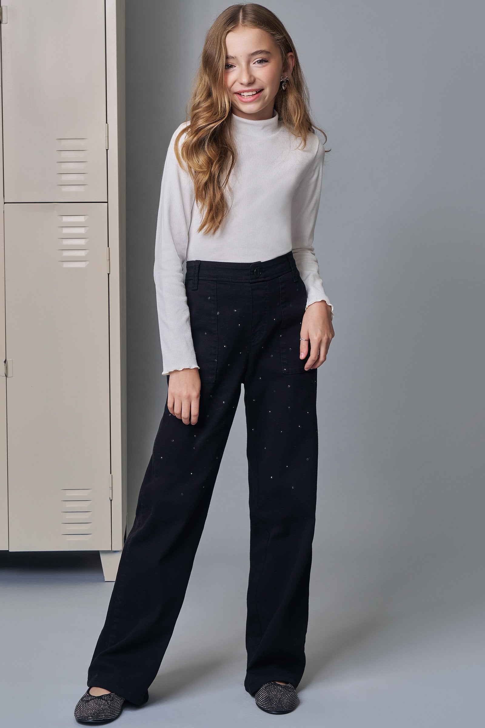 A calça reta em sarja com elastano, é a escolha perfeita para as meninas que amam um look cheio de conforto, sem abrir mão do estilo no dia à dia! Disponível em uma cor super estilosa - preto - ela é uma peça essencial, perfeita para montar diversos looks e deixar o inverno das pequenas ainda mais estiloso! A aplicação de strass, adiciona um charme especial à peça.