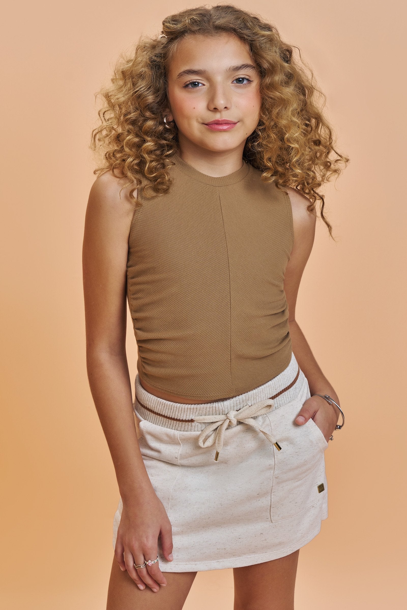 A regata, em tom caramelo, tem modelagem ajustada, gola alta e detalhe franzido nas laterais, que valoriza o corpo com muito conforto.