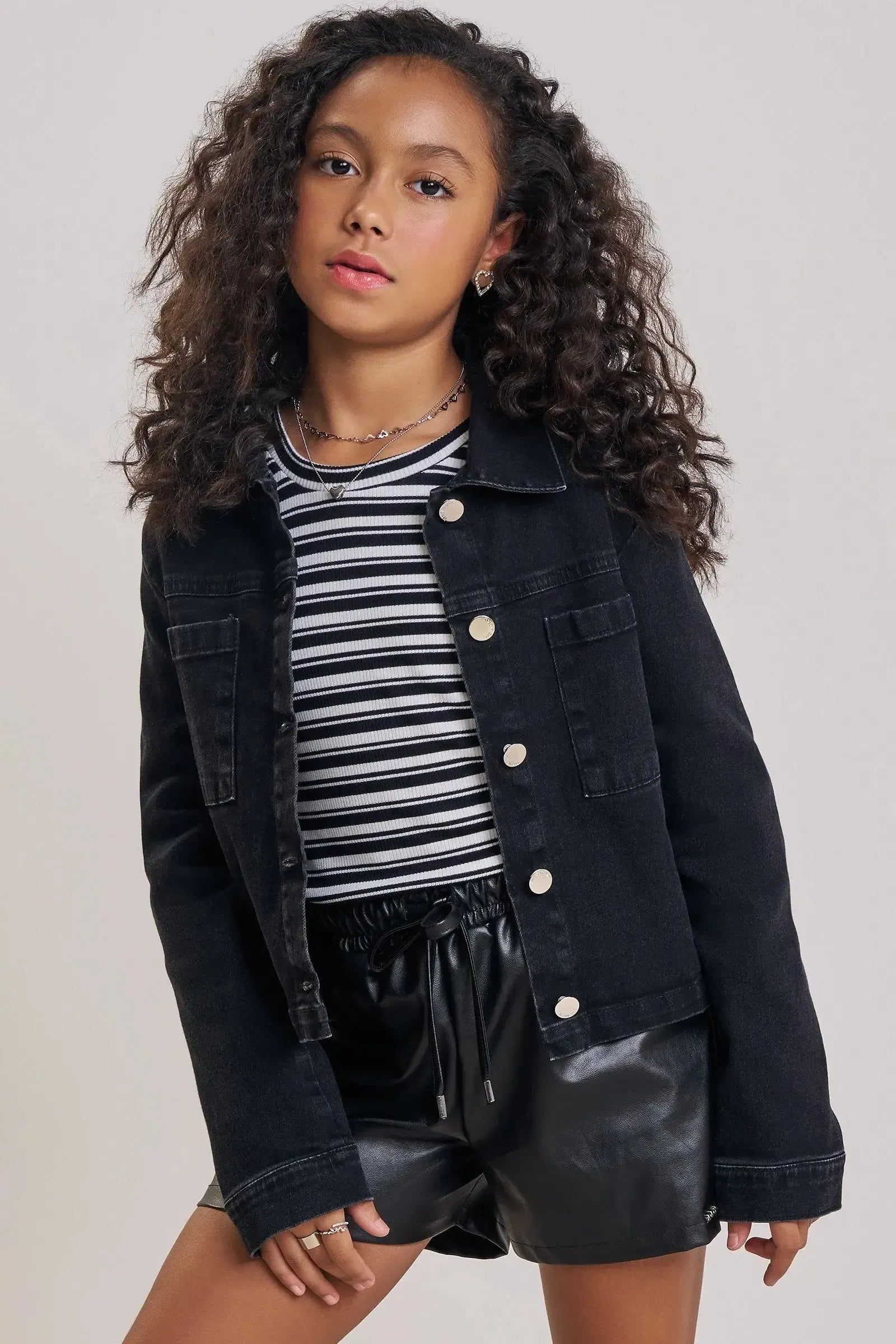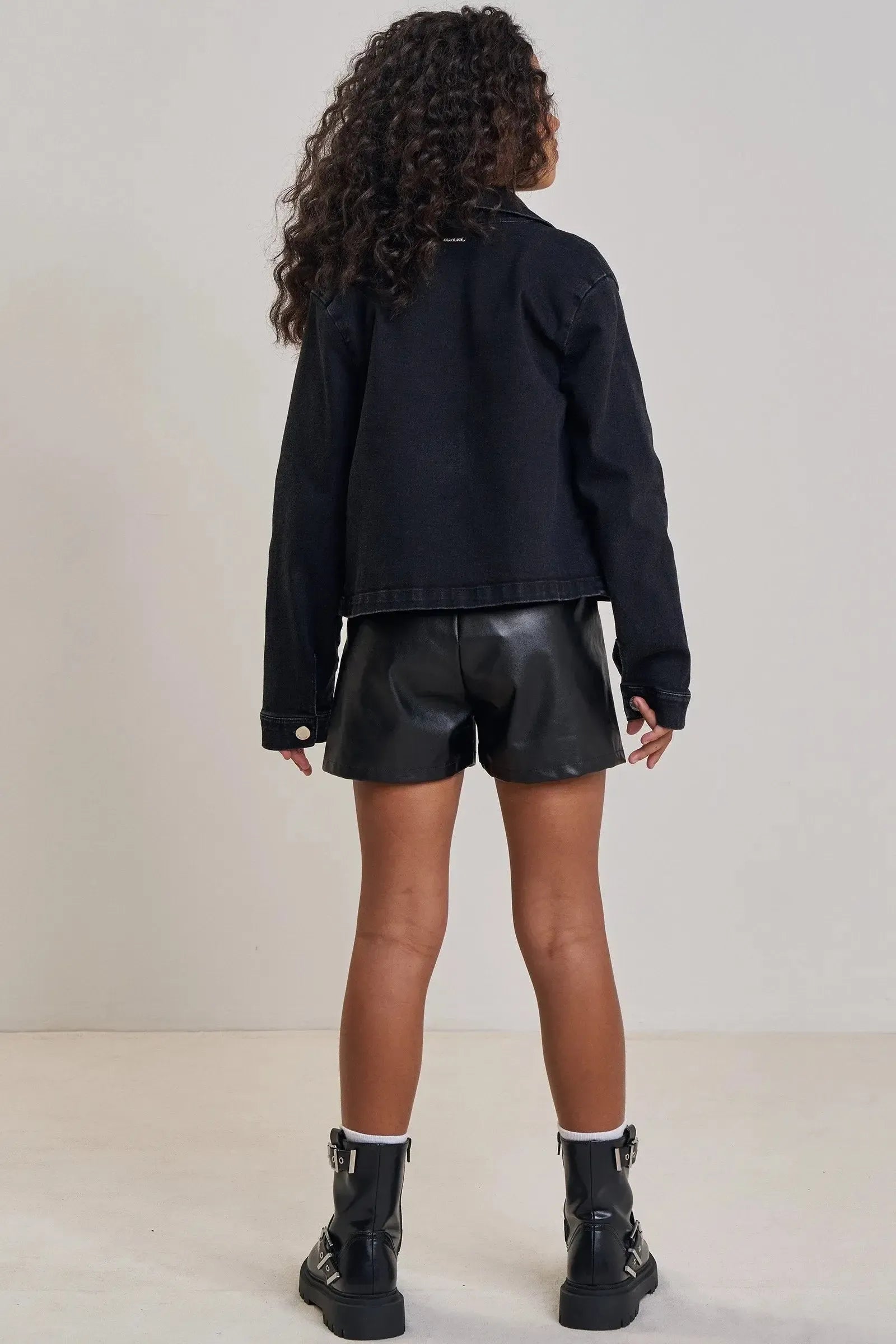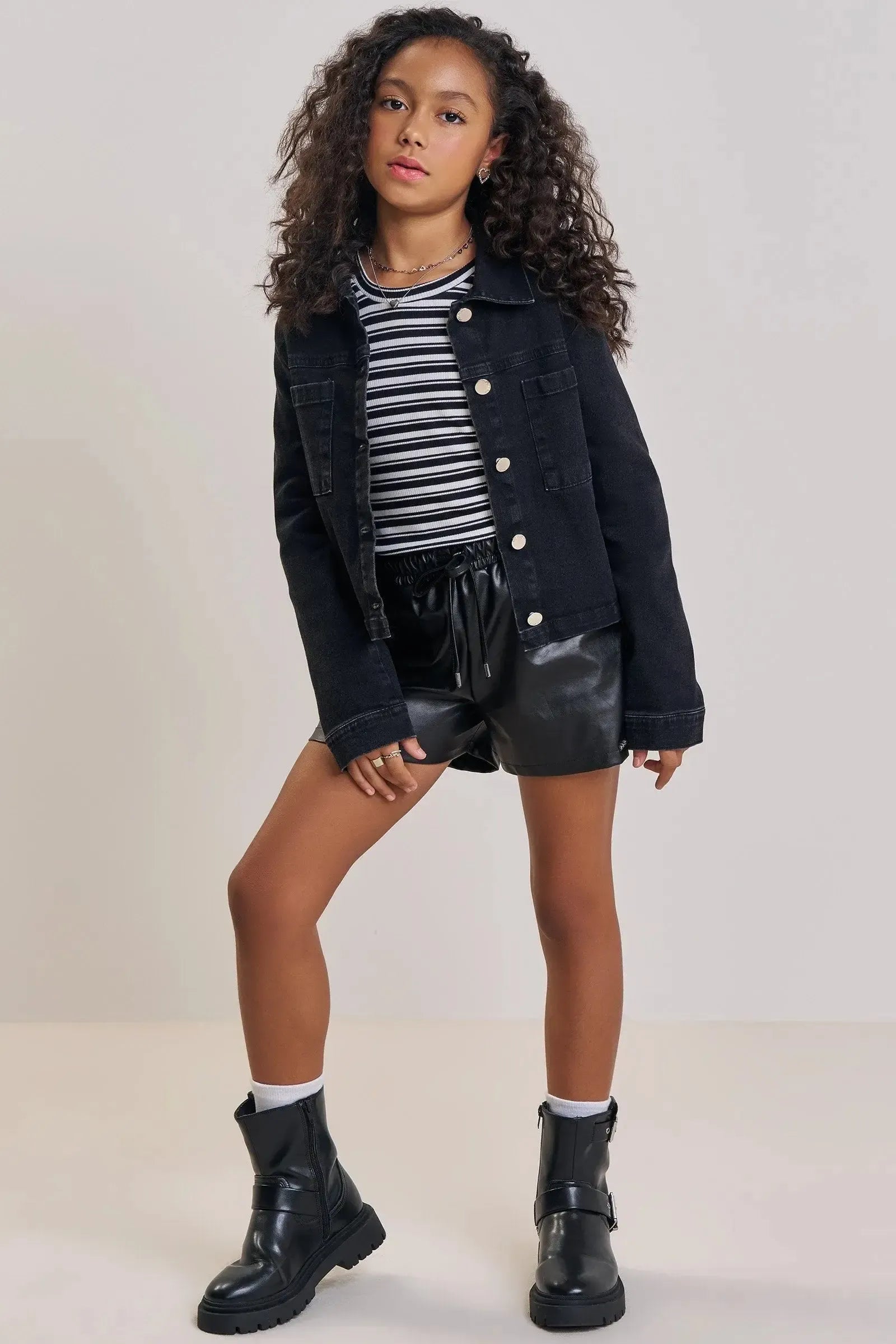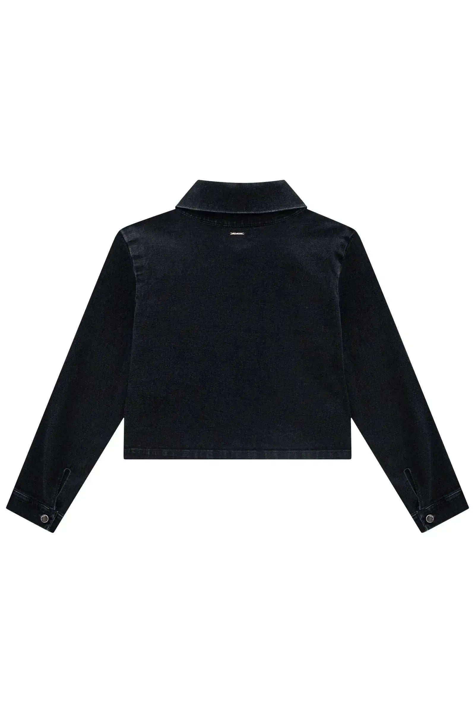 A jaqueta boxy em jeans black com elastano, é a escolha perfeita para as meninas que amam um look cheio de conforto, sem abrir mão do estilo no dia à dia! Disponível em uma cor super estilosa - preto - ela é uma peça essencial, perfeita para montar diversos looks e deixar o inverno das pequenas ainda mais estiloso!