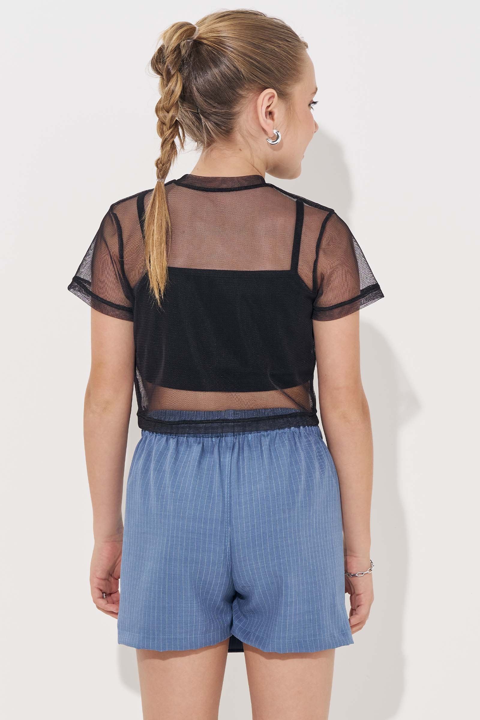 A blusa sobreposição em tule e top em canelado liz é a escolha perfeita para as garotas que adoram estar por dentro das últimas tendências e expressar seu estilo com atitude. Disponível em duas cores super estilosas - bege e preto - esta peça cria um visual moderno e super descolado.
