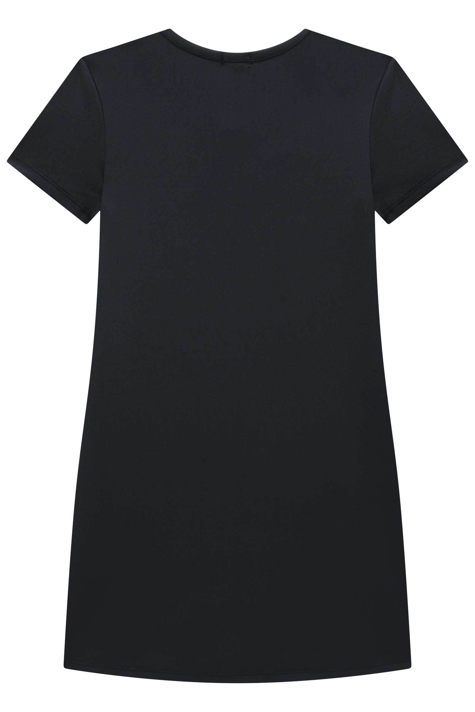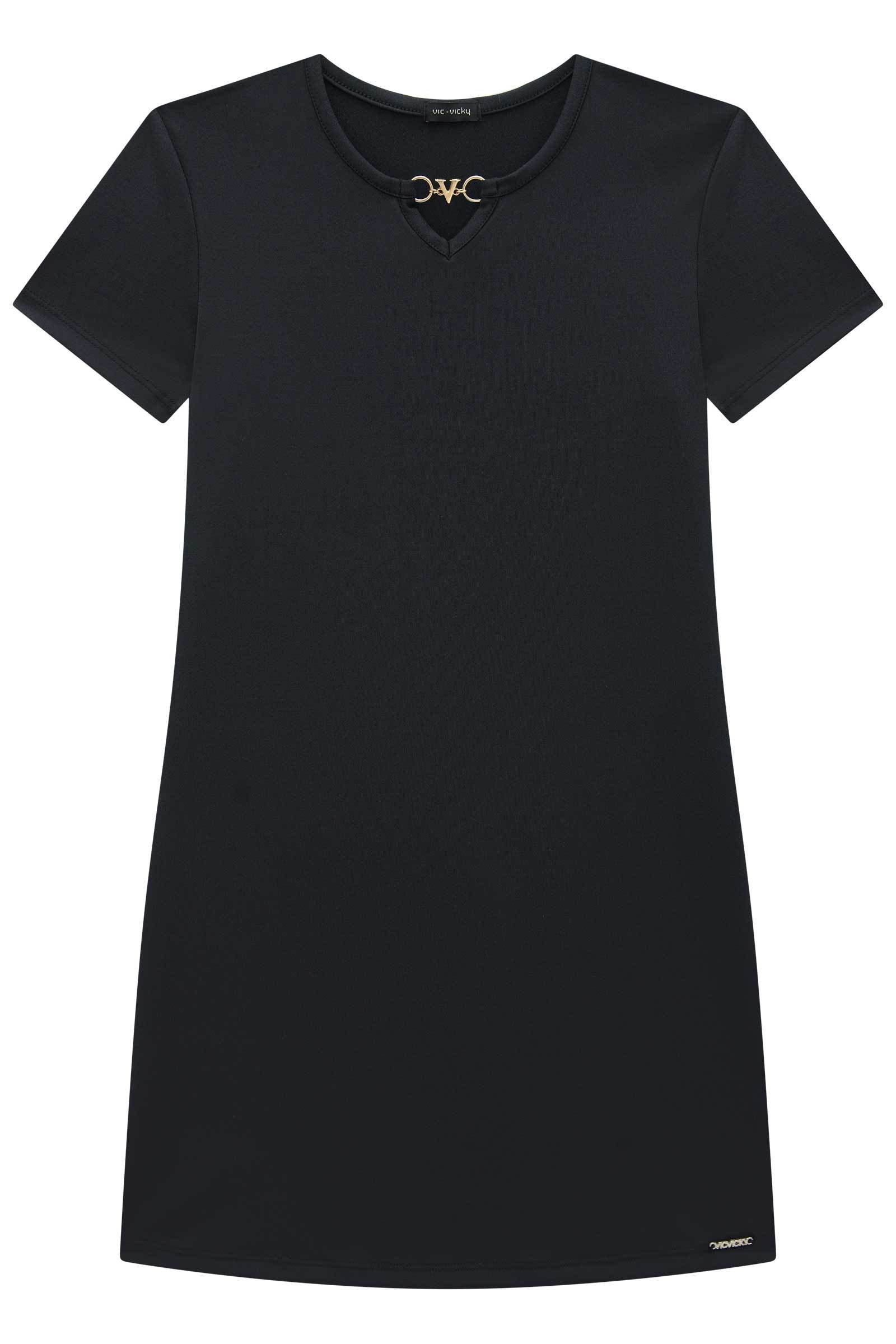 Com modelagem reta e mangas curtas, o vestido é ideal para compor produções casuais ou urbanas, podendo ser usado com tênis, sandália ou até jaqueta por cima.