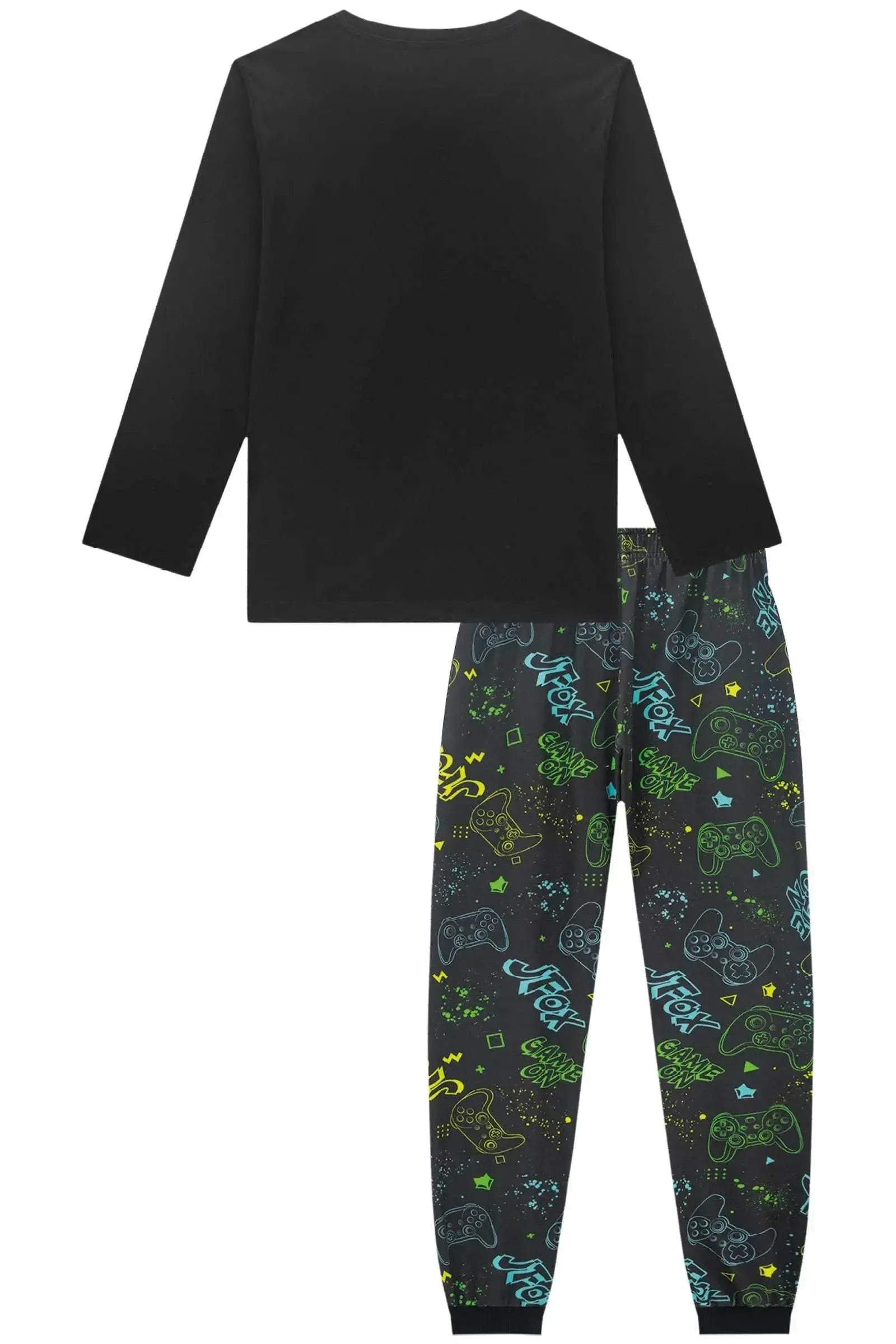 O conjunto de pijama de camiseta em meia malha e calça jogger em malha comfy, é a escolha perfeita para os meninos que amam um look cheio de conforto, sem abrir mão do estilo no dia à dia! Disponível em uma cor super estilosa - preto - ela é uma peça essencial, perfeita para montar diversos looks e deixar o inverno dos pequenos ainda mais estiloso! A estampa divertida, adiciona um charme especial à peça.